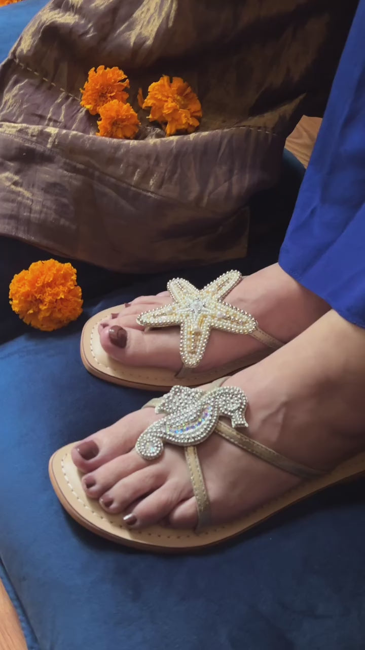 Our best seller is now available in a silver and gold color, made specially for this festive season. Larry starfish and seahorse sandals is handmade with premium quality pure leather and embroidered with differently sized beads, that give her a 3-D effect making the starfish and seahorse look real.