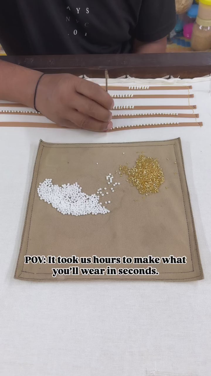 This unique design features elastic straps for a snug fit, adorned with hand-embroidered gold and white beads, creating the illusion of draped tassels. Complete with a chic toe loop and set upon a pale nude base, Soha epitomizes elegance and style.